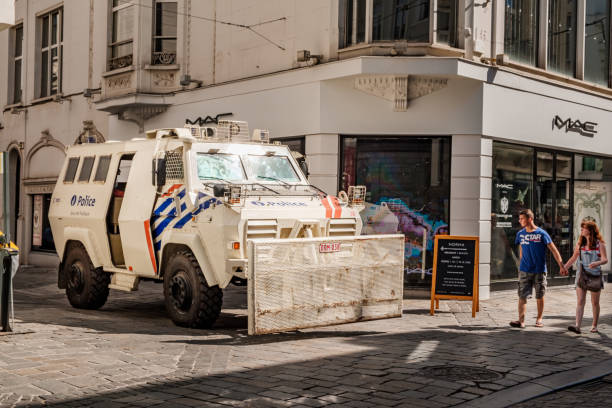 Ghent, Flanders, Belgium – July 15 2018 : white armored riot truck with front clearing blade of Belgian police parked on the corner of a street downtown while a young couple passes by
