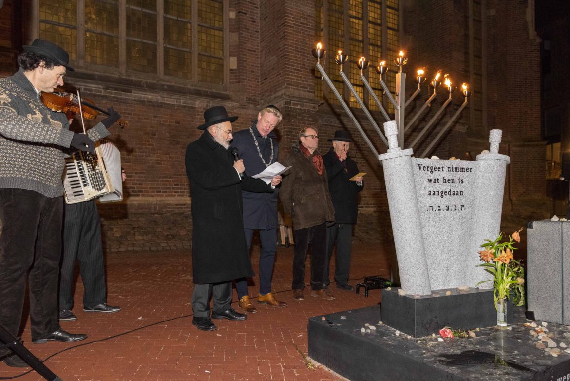 Het was winderig, koud, regenachtig, knallend vuurwerk… en toch zeker meer dan honderd aanwezigen. Een voorzitter die zeer goed voorbereid het openingswoord sprak, Mevrouw Palland stak de sjamasj aan, ik de rest. En toen weerklonk daar luid en duidelijk langs de kade van de IJssel voor de gesloten deuren van de voormalige synagoge, het Ma’oz Tsoer. Het was alsof de namen op de herdenkingsteen meeluisterden en meezongen. Geweldig te zien hoe goed het Kampense lid van de Tweede Kamer haar toespraak had voorbereid. Mijn toespraak had qua lengte meer weg van een lezing. Maar het was muisstil. Mijn woorden drongen door. Mijn oproep tot tolerantie werd gevoeld. Dat kleine ongetrainde groepje Joden van toen voerde oorlog tegen een gigantische overmacht. Weinigen tegen velen. Zwakken tegen sterken… de weinigen en zwakken overwonnen.